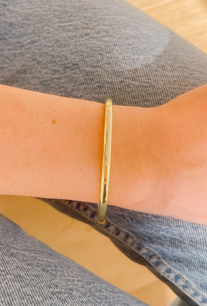 Our beverly bangle is a staple piece for your collection. Featuring a solid shiny finish creating a beautiful plain gold bangle. This piece is a great one to start with and then build in other pieces to compliment your look.
