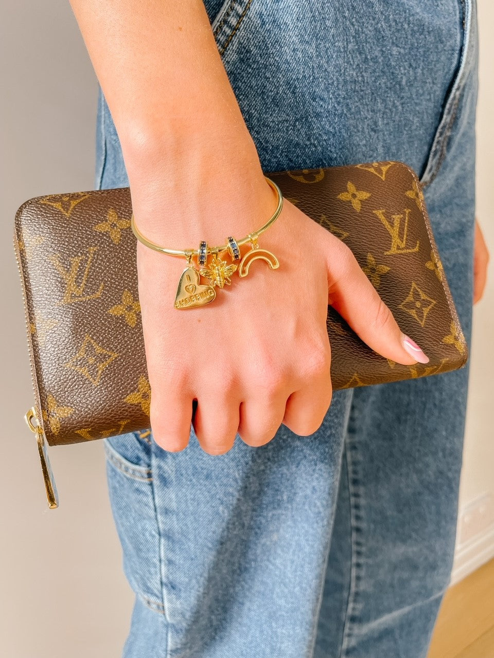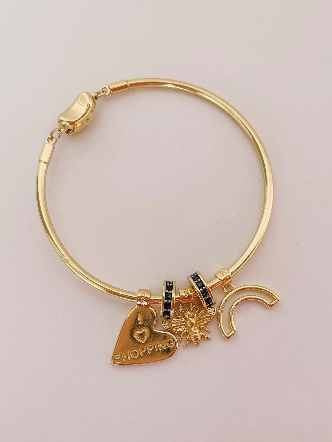 - Gold charm bangle with easy open bean clasp