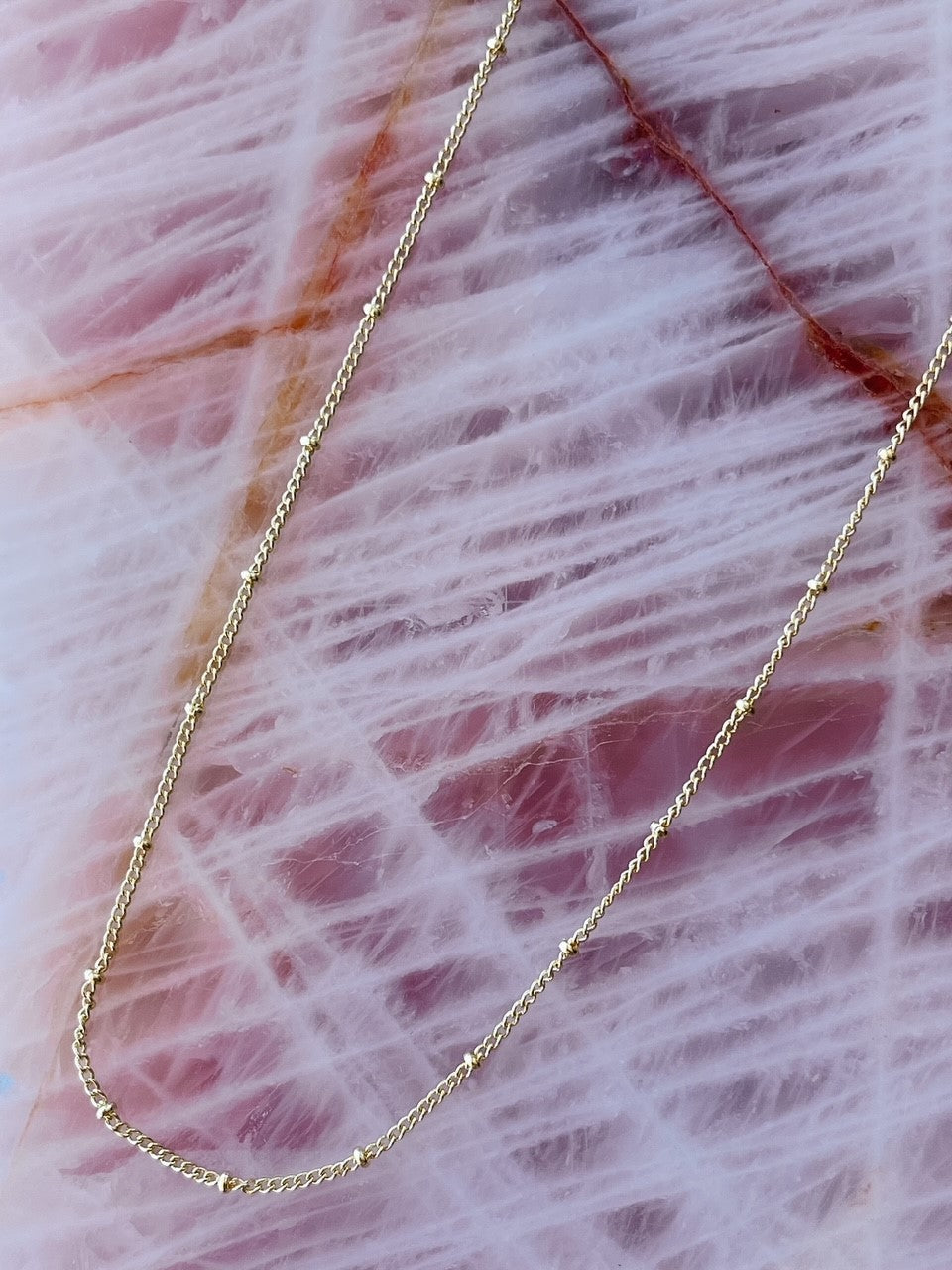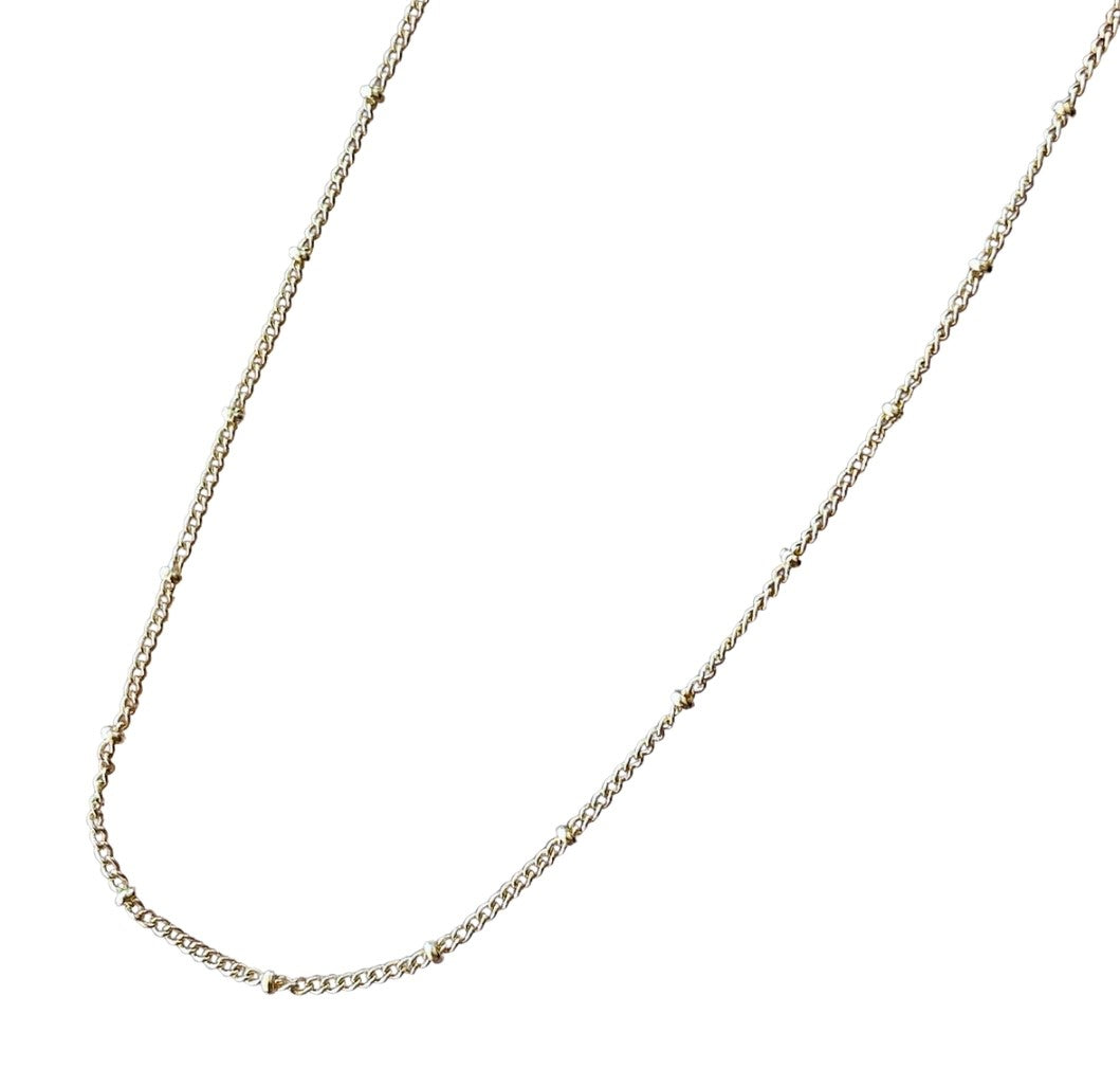 Our short Bobble Chain is a combination of a traditional curb chain with beads added to it. It creates a dressy vibe and looks great worn alone or with a charm added.