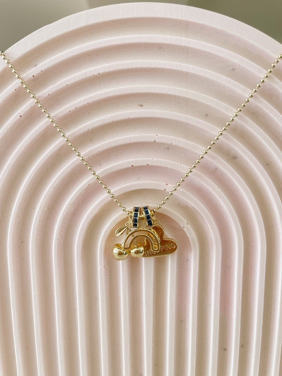 Introducing you to our newest charm bundle! This bundle contains the following beautiful pieces: - 3 of our most popular gold charms - the Cherry charm, Rainbow charm and Shopping charm - 2 navy blue stone spacers - Hanging on our gold...Read more